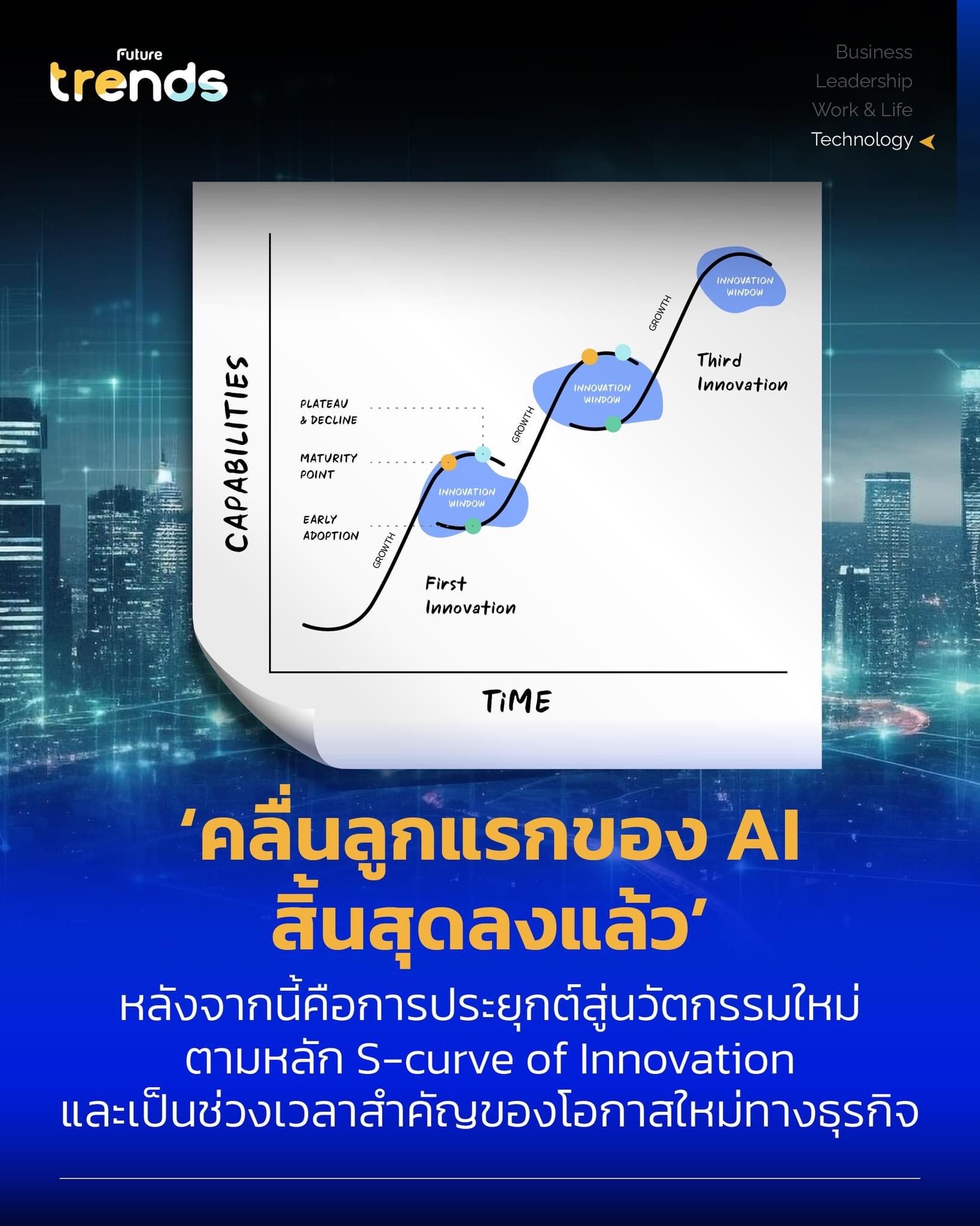 เมื่อนำแนวคิด S-curve มาใช้กับ AI เราจะเห็นว่าเทคโนโลยีนี้กำลังเข้าสู่ช่วงท้ายของเส้นโค้ง S แรก