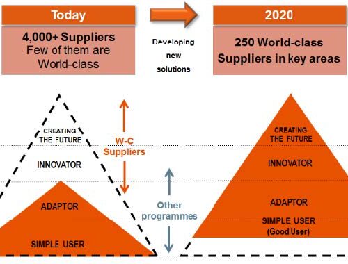(2) การดำเนินงานในโครงการนี้จนถึงธันวาคม 2012 บริษัทใช้จ่ายเงินไปทั้งสิ้น 121 ล้าน USD ในขณะที่ความสามารถของ Suppliers ที่เกิดขึ้นนั้นสามารถคานวณประกอบเป็นยอดขายได้ถึง 400 ล้าน USD (หมายความว่า หากบุคลากรของ Suppliers ที่ผ่านการอบรมนี้ไปเสนอตัวทำโครงการต่าง ๆ พวกเขาจะคิดค่างานเพิ่มขึ้นในอัตราใหม่เป็น 400 ล้าน USD)
