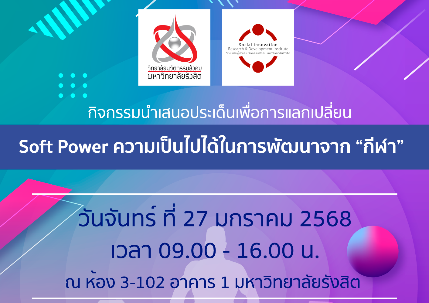 09.15 – 10.45 น. นำเสนอประเด็น หัวข้อ Soft Power นวัตกรรมสังคม และกรณีศึกษาของกิจการกีฬา