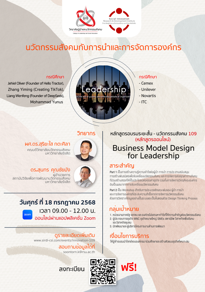 โครงเนื้อหาของการจัดอบรมในหัวข้อนี้ จะเป็นการสร้างความรู้ความเข้าใจถึงการบริหารงานนวัตกรรมสังคมกับองค์กรประเภทต่าง ๆ ทั้งภาครัฐ ธุรกิจ และองค์กรไม่แสวงหากำไร ทั้งในระดับผลิตภัณ์ โครงการ ยุทธศาสตร์องค์กร และการขับเคลื่อนนโยบาย รวมทั้งการให้ความสำคัญต่อรูปแบบของการบริหารจัดการที่เปลี่ยนแปลงไปจากเดิมอย่างสิ้นเชิง ตัวอย่าง เช่น Jehiel Oliver (จาก Hello Tractor) Zhang Yiming, Liang Wenfeng, Mohammad Yunus, Cemex, Unilever, Novartis, ITC ฯลฯ ในขณะเดียวกัน ก็จะมีการผสมผสานไปกับตัวอย่างจากกรณีศึกษาจากประสบการณ์ของอาจารย์และวิทยากรผู้สอน