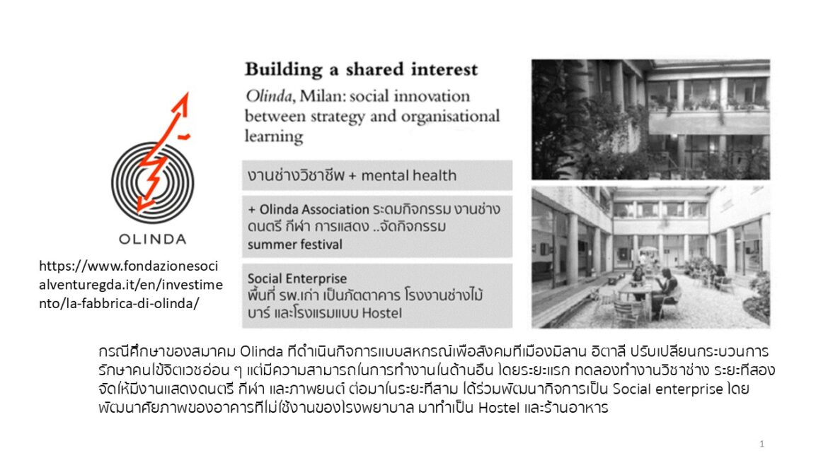 กรณีศึกษาของสมาคม Olinda ที่ดำเนินกิจการแบบสหกรณ์เพื่อสังคมที่เมืองมิลาน อิตาลี ปรับเปลี่ยนกระบวนการรักษาคนไข้จิตเวชอ่อน ๆ แต่มีความสามารถในการทำงานในด้านอื่น ๆ โดยระยะแรก ทดลองทำงานวิชาช่าง ระยะที่สองจัดให้มีงานแสดงดนตรี กีฬา และภาพยนต์ ต่อมาในระยะที่สาม ได้ร่วมพัฒนากิจการเป็น Social enterprise โดยพัฒนาศักยภาพของอาคารที่ไม่ใช้งานของโรงพยาบาล มาทำเป็น Hostel และร้านอาหาร