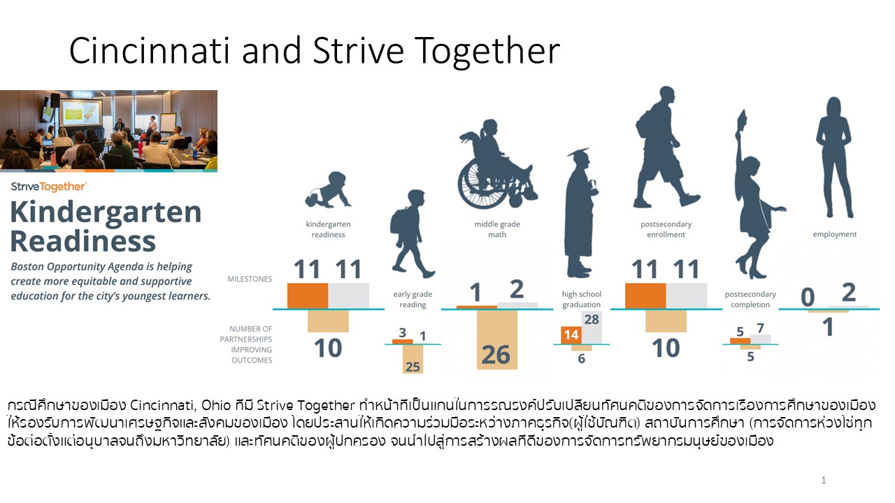 กรณีศึกษาของเมือง Cincinnati, Ohio ที่มี Strive Together ทำหน้าที่เป็นแกนในการรณรงค์ปรับเปลี่ยนทัศนคติของการจัดการเรื่องการศึกษาของเมืองให้รองรับการพัฒนาเศรษฐกิจและสังคมของเมือง โดยประสานให้เกิดความร่วมมือระหว่างภาคธุรกิจ(ผู้ใช้บัณฑิต) สถาบันการศึกษา (การจัดการห่วงโซ่ทุกข้อต่อตั้งแต่อนุบาลจนถึงมหาวิทยาลัย) และทัศนคติของผู้ปกครอง จนนำไปสู่การสร้างผลที่ดีของการจัดการทรัพยากรมนุษย์ของเมือง