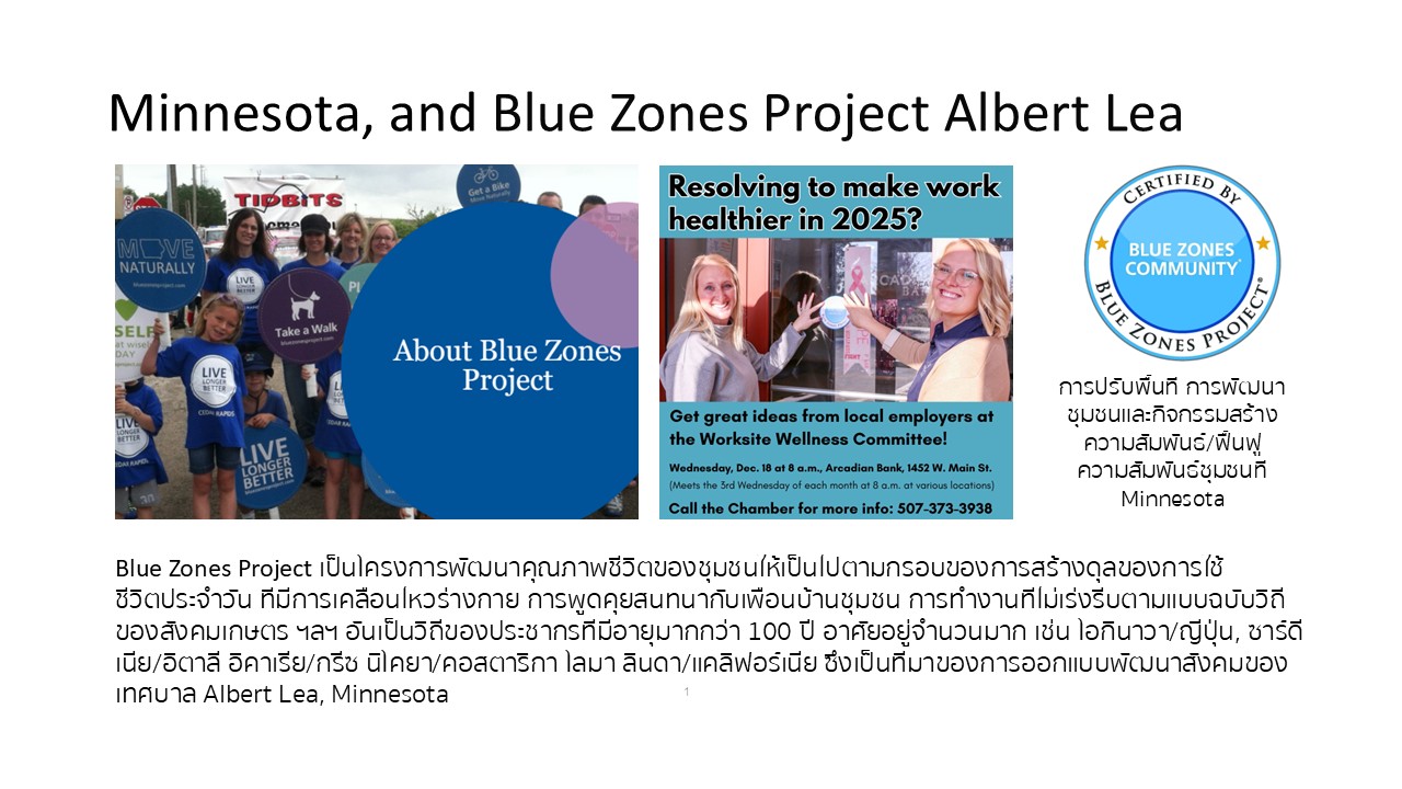 Blue Zones Project เป็นโครงการพัฒนาคุณภาพชีวิตของชุมชนให้เป็นไปตามกรอบของการสร้างดุลของการใช้ชีวิตประจำวัน ที่มีการเคลื่อนไหวร่างกาย การพูดคุยสนทนากับเพื่อนบ้านชุมชน การทำงานที่ไม่เร่งรีบตามแบบฉบับวิถีของสังคมเกษตร ฯลฯ อันเป็นวิถีของประชากรที่มีอายุมากกว่า 100 ปี อาศัยอยู่จำนวนมาก เช่น โอกินาวา/ญี่ปุ่น, ชาร์ดีเนีย/อิตาลี อิคาเรีย/กรีซ นิโคยา/คอสตาริกา โลมา ลินดา/แคลิฟอร์เนีย ซึ่งเป็นที่มาของการออกแบบพัฒนาสังคมของเทศบาล Albert Lea, Minnesota