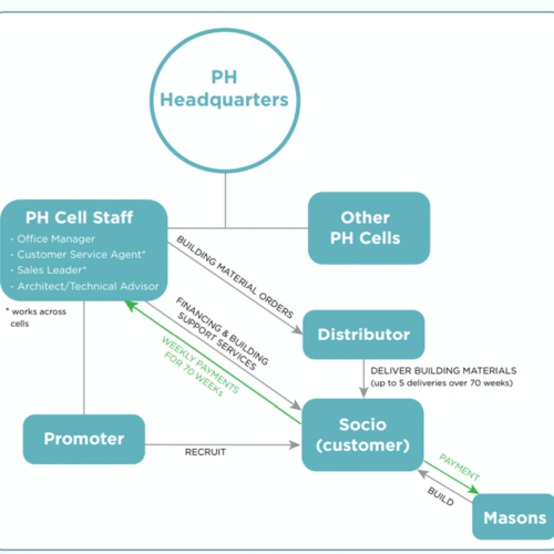 CEMEX จัดตั้ง PH Cell Staff ขึ้นเพื่อทำหน้าที่เป็นหน่วยริเริ่มการแสวงหาลูกค้าและสร้างยอดขาย ประกอบด้วย ฝ่ายจัดการสำนักงาน เอเยนต์บริการลูกค้า หัวหน้าทีมขาย และที่ปรึกษาด้านเทคนิคและสถาปนิก เพื่อปฏิบัติการต่าง ๆ ของโครงการเพื่อสนับสนุนลูกค้าของโครงการ ทั้ง Technical Assistance, Financial, Building Materials, Construction Services การแบ่งงาน จะแบ่งเป็น 3 ส่วน คือ (1) ส่วนส่งเสริม (Promoter) เพื่อชักชวนลูกค้า/คู่ค้าให้เข้ามาร่วมโครงการออมเพื่อร่วมสร้างเครดิตเพื่อสร้าง Socio หรืออีกสถานะหนึ่ง ก็คือ การสร้างลูกค้า/คู่ค้าแบบช่วยเหลือทางสังคม (2) ส่วนประสานงานร้านค้า (Distributor) เพื่อจัดบริการวัสดุก่อสร้างสำหรับลูกค้า/คู่ค้าที่เข้าร่วมโครงการ และมีการดำเนินงานตามระเบียบขั้นตอนต่าง ๆ และได้รับอนุมัติสินเชื่อจากโครงการแล้ว (3) Other PH Cells ประสานงานอื่นเพื่อให้บริการนี้ดำเนินการไปด้วยความมีประสิทธิภาพ เช่น งานสถาปนิก วิศวกร และการเงิน ฯลฯ