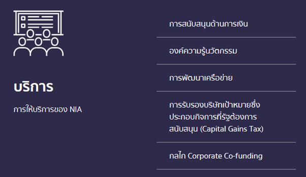 รายละเอียด : การสนับสนุนด้านการเงินของ NIA เป็นการสนับสนุนในรูปแบบของ “เงินทุน” โดยเป็นทุนให้เปล่า (Grant) ไม่เกินร้อยละ 75 ของมูลค่าโครงการที่ขอรับการสนับสนุน